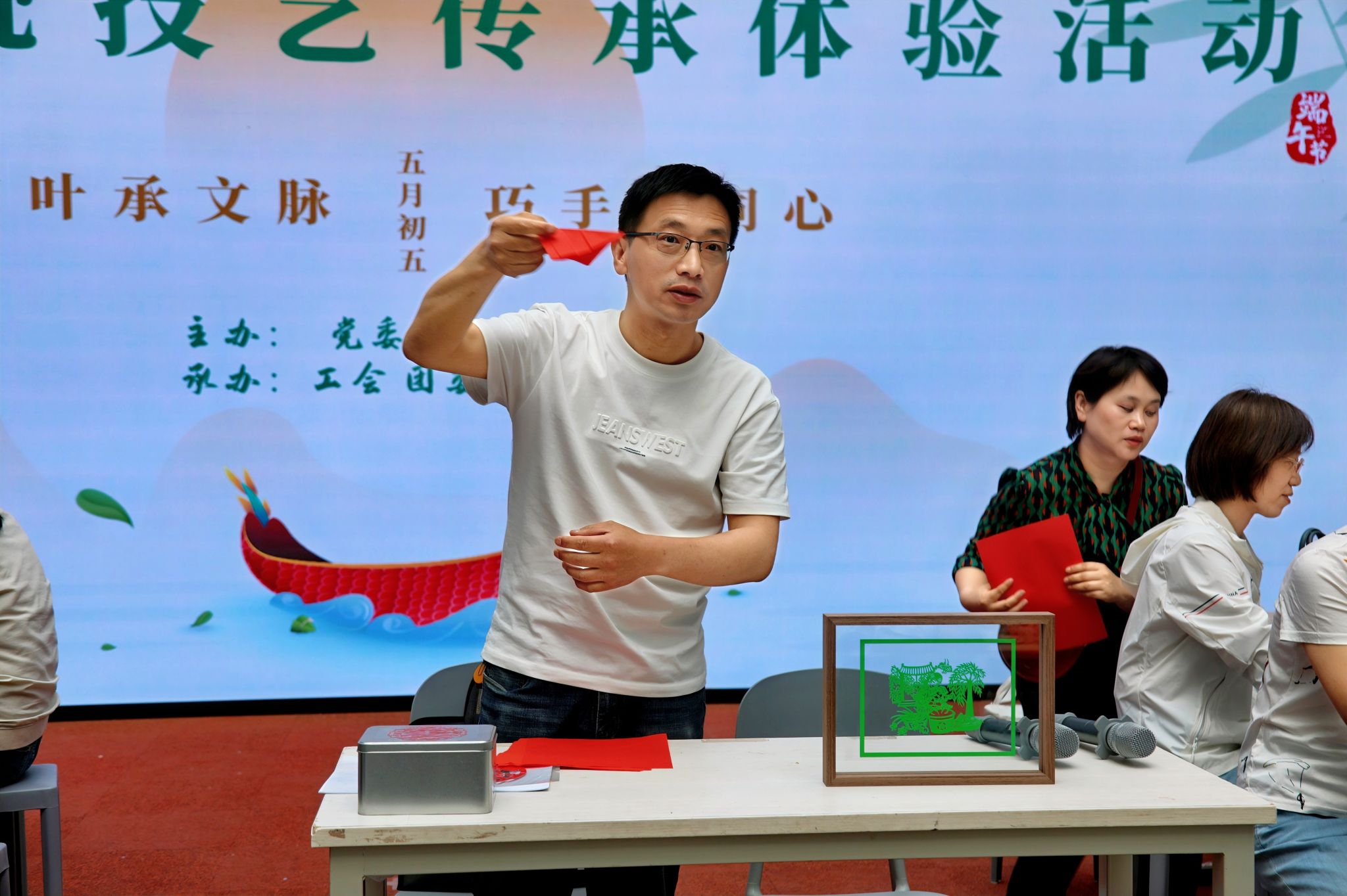 展示结束后,大家开始亲手制作端午剪纸、艾草花束、香囊、五彩绳。在剪纸体验区,大家在张老师的指导下,学习用刻刀创作端午主题剪纸作品;艾草花束制作区清香阵阵,教职工们将艾叶、菖蒲等传统草药精心捆扎成束;香囊缝制区内,彩线穿梭间,一个个蕴含中医药智慧的香囊逐渐成型;五彩绳编织区也很受青睐,五色丝线在指尖缠绕,编织出寓意吉祥的长命缕。